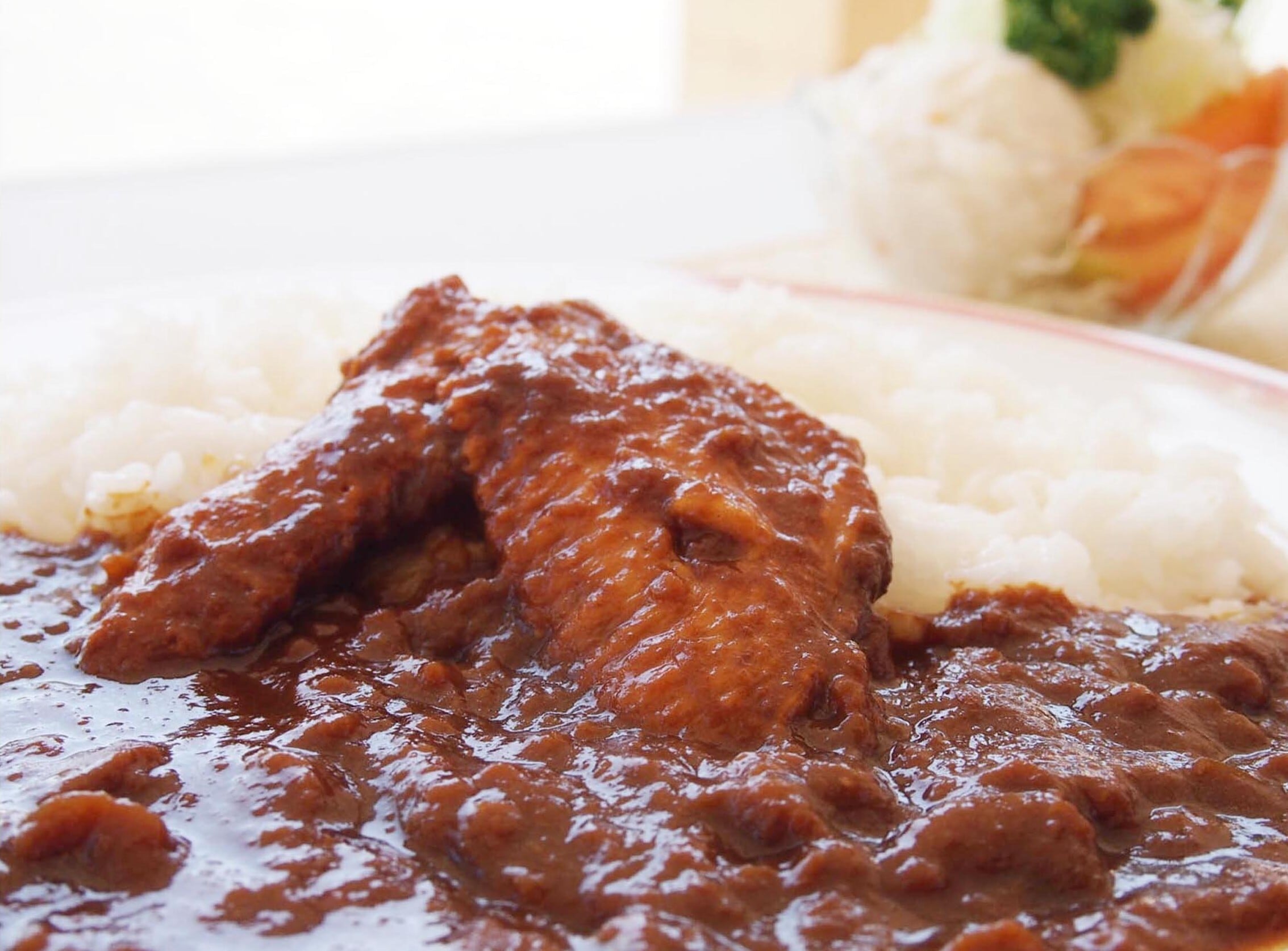 手羽先やわ煮カレーは、奥美濃古地鶏の手羽先がまるまる一本入った贅沢なカレー。よく煮込まれた手羽先は、スプーンでほろほろとほぐれる程の柔らかさです。ほぐした肉をルーに絡めてお召し上がりください。
