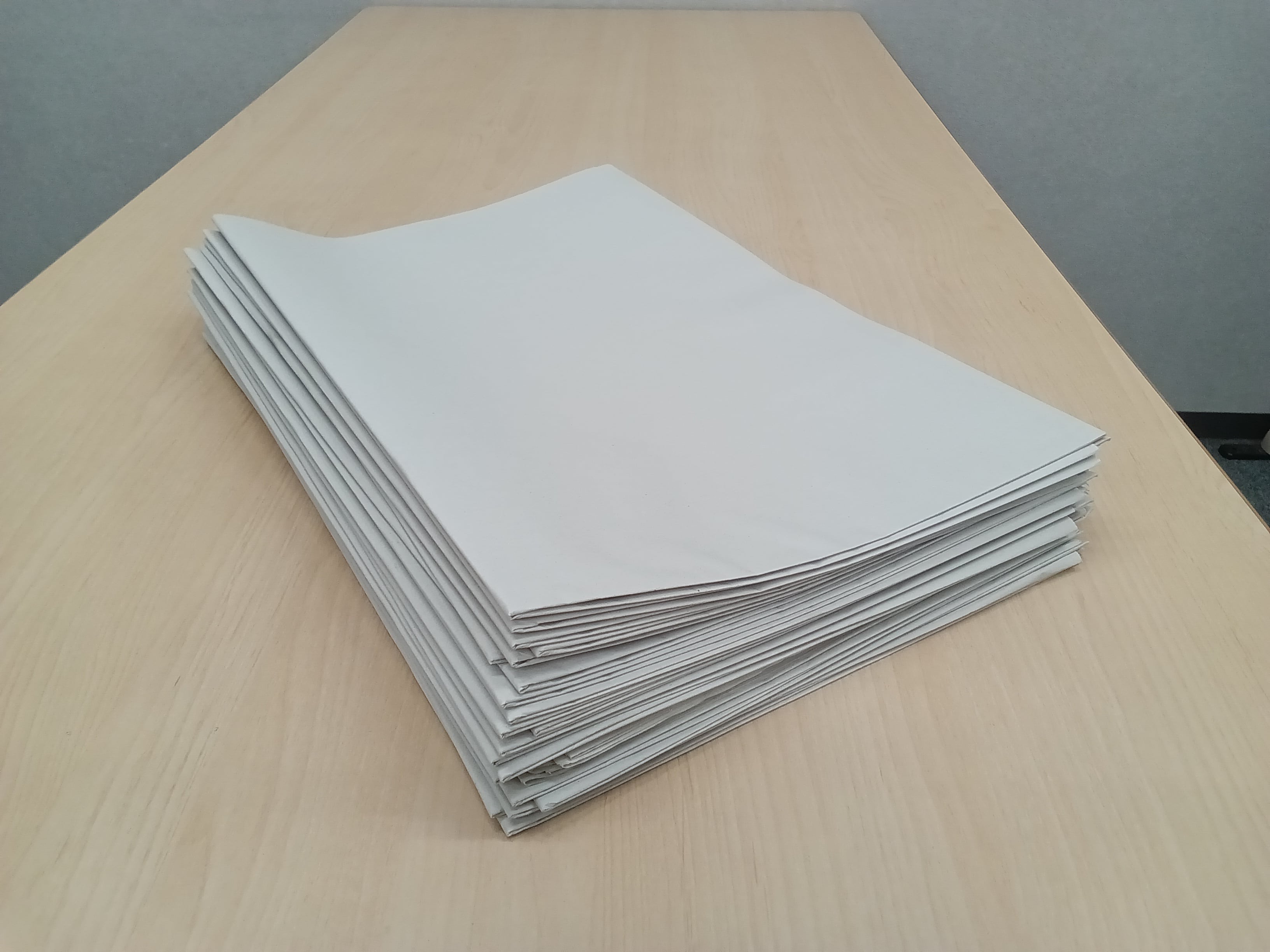 印刷されていない無地の新聞紙です。薄くて軽く、吸水性があります。実際の新聞紙と同じ縦545ミリ×横810ミリ(誤差、各2ミリ)サイズ。いろいろな用途にお使いいただけます。